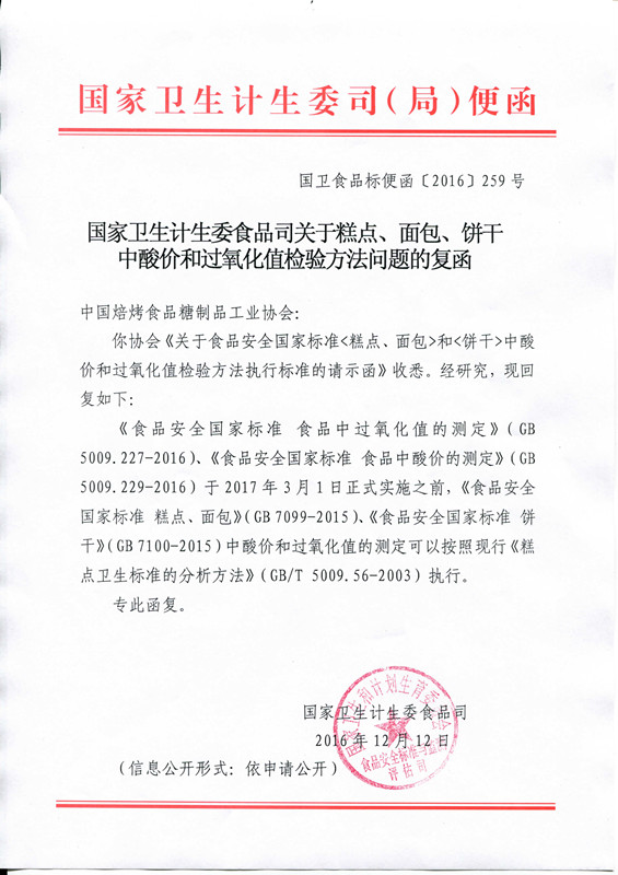 國家衛(wèi)計(jì)委關(guān)于糕點(diǎn)面包酸價(jià)等檢驗(yàn)方法的回復(fù)函