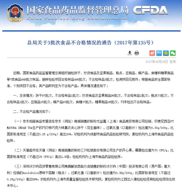 食藥監(jiān)總局網(wǎng)站15日信息顯示,食藥監(jiān)總局組織抽檢餅干及堅果制品等7類食品,抽樣檢驗項目合格樣品446批次,不合格樣品3批次。其中,三只松鼠股份有限公司生產(chǎn)的開心果,霉菌檢出值為70 CFU/g,超出國家標(biāo)準(zhǔn)規(guī)定1.8倍。