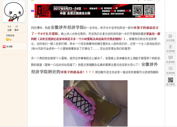 轉(zhuǎn)載:安徽涉外經(jīng)濟(jì)學(xué)院附近“洋果子”甜品店訂的生日蛋糕全是螞蟻!??!