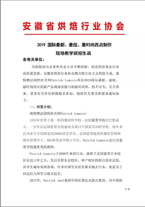 為鼓勵業(yè)內(nèi)企業(yè)和從業(yè)人員不斷創(chuàng)新,促進(jìn)烘焙食品行業(yè)高質(zhì)量發(fā)展,安徽省烘焙行業(yè)協(xié)會攜合肥左拉主義烘焙天地,現(xiàn)特聘法國烘焙名師Patrick Lemesie舉辦2019國際最新、最炫、最時尚西點(diǎn)創(chuàng)新產(chǎn)品現(xiàn)場實操與制做培訓(xùn)班,機(jī)不可失,失不再來,望各有關(guān)單位積極報名參加。現(xiàn)將有關(guān)事項和要求通知如下: