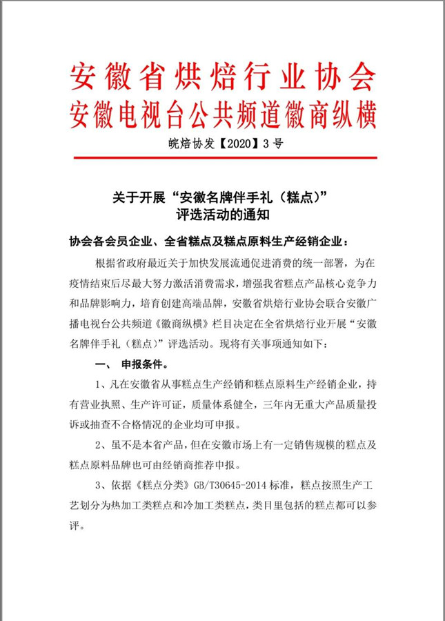 關(guān)于開(kāi)展“安徽名牌伴手禮(糕點(diǎn))” 評(píng)選活動(dòng)的通知