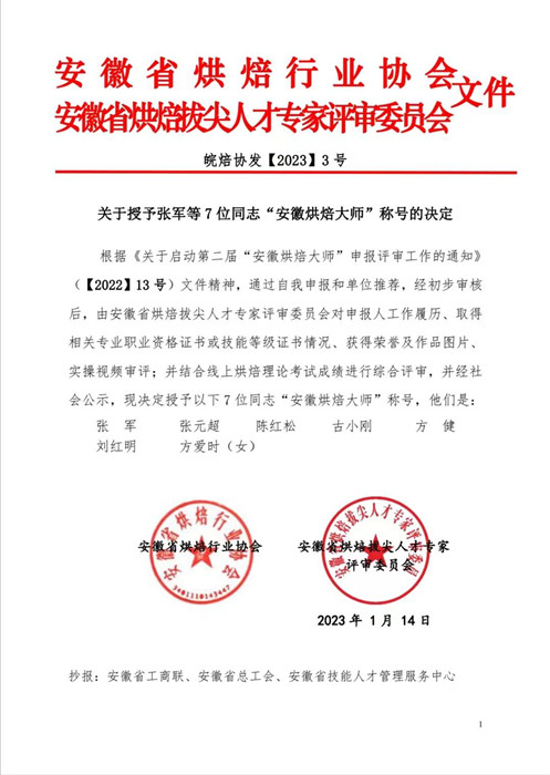 根據(jù)《關(guān)于啟動第二屆“安徽烘焙大師”申報評審工作的通知》(【2022】13號)文件精神,通過自我申報和單位推薦,經(jīng)初步審核后,由安徽省烘焙拔尖人才專家評審委員會對申報人工作履歷、取得相關(guān)專業(yè)職業(yè)資格證書或技能等級證書情況、獲得榮譽及作品圖片、實操視頻審評;并結(jié)合線上烘焙理論考試成績進行綜合評審,并經(jīng)社會公示,現(xiàn)決定授予張軍等7位同志“安徽烘焙大師”稱號,詳情見文件。