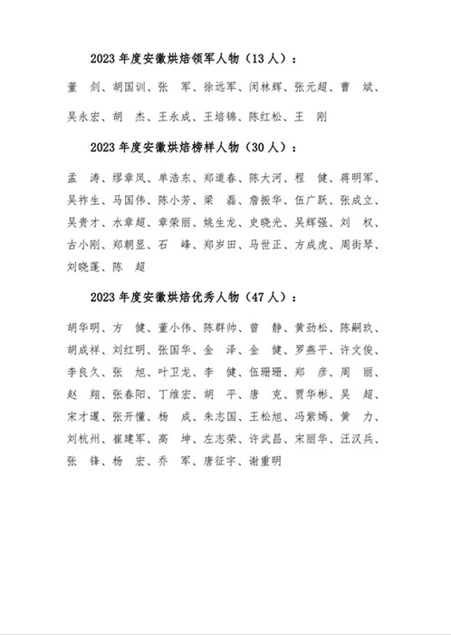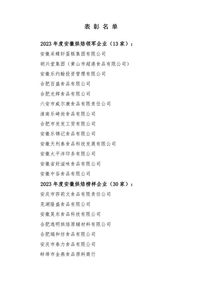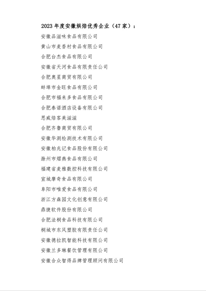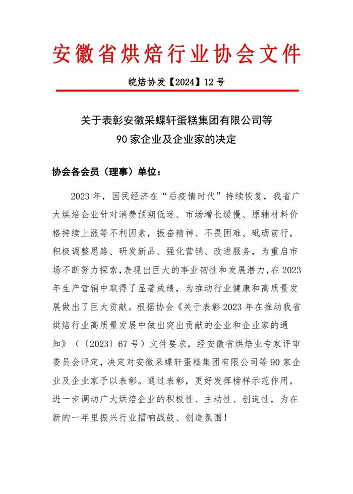 瑞獸辭舊歲,龍門待躍新,值此辭舊迎新(新春佳節(jié))之際,協(xié)會向各位老總致以最誠摯的問候!新年伊始,安徽烘焙人精神抖擻,更加振奮。根據(jù)協(xié)會(2023)67號文件,經(jīng)安徽省烘焙業(yè)專家評審委員會評定:安徽采蝶軒蛋糕集團(tuán)有限公司等90家企業(yè)及企業(yè)家光榮上榜,獲得嘉獎。感謝你們?yōu)檗k好企業(yè)、開拓市場,推動行業(yè)發(fā)展與進(jìn)步做出的探索和努力。希望在龍年各位再攀高峰、續(xù)書華章、凝心聚力、再創(chuàng)輝煌!